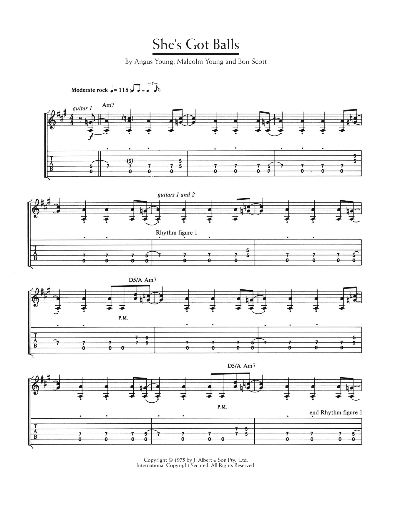 Download or print AC/DC She's Got Balls sheet music, chords and digital score arranged for Guitar Chords/Lyrics. This Rock score includes 2 page(s).