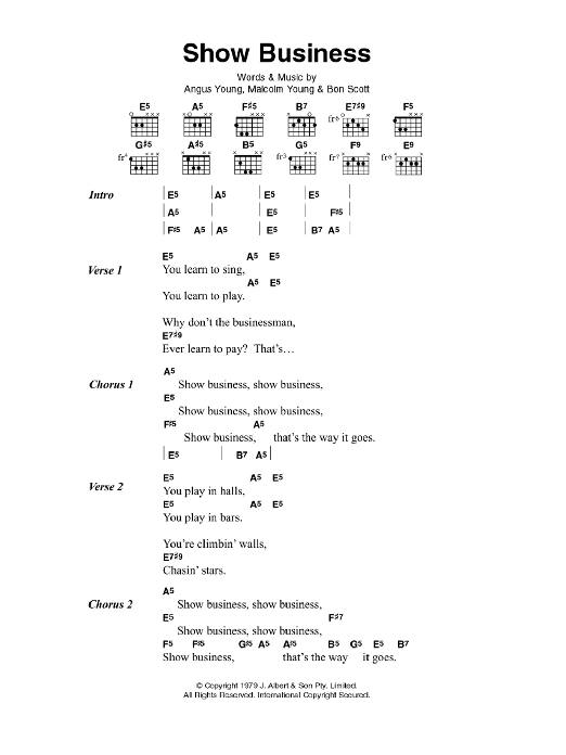 Download or print AC/DC Show Business sheet music, chords and digital score arranged for Guitar Chords/Lyrics. This Rock score includes 3 page(s).