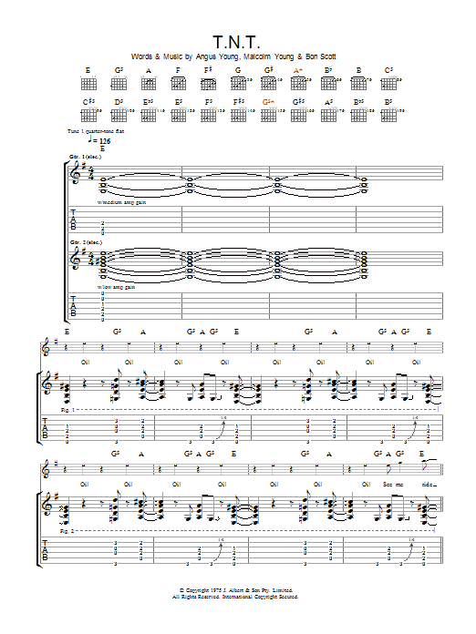 Download or print AC/DC T.N.T. sheet music, chords and digital score arranged for Guitar Tab. This Metal score includes 8 page(s).