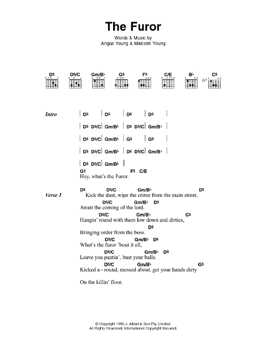 Download or print AC/DC The Furor sheet music, chords and digital score arranged for Guitar Chords/Lyrics. This Rock score includes 3 page(s).