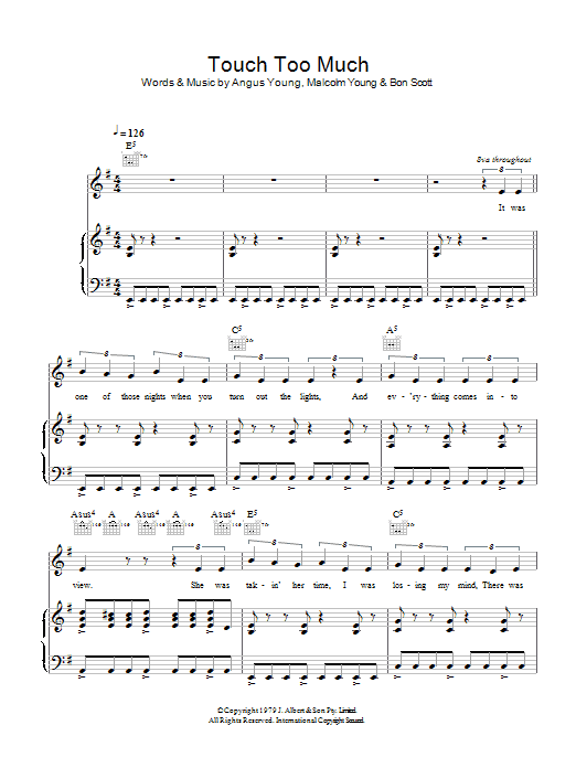 Download or print AC/DC Touch Too Much sheet music, chords and digital score arranged for Guitar Chords/Lyrics. This Rock score includes 3 page(s).