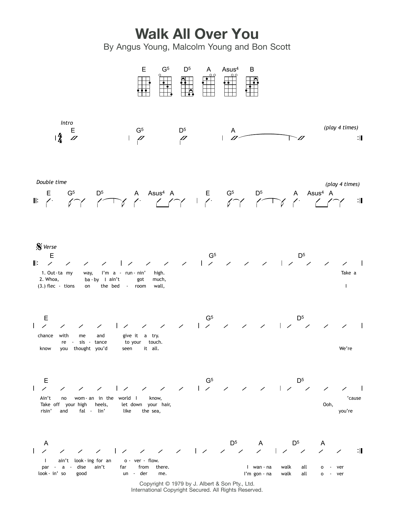 Download or print AC/DC Walk All Over You sheet music, chords and digital score arranged for Ukulele Chords/Lyrics. This Rock score includes 2 page(s).