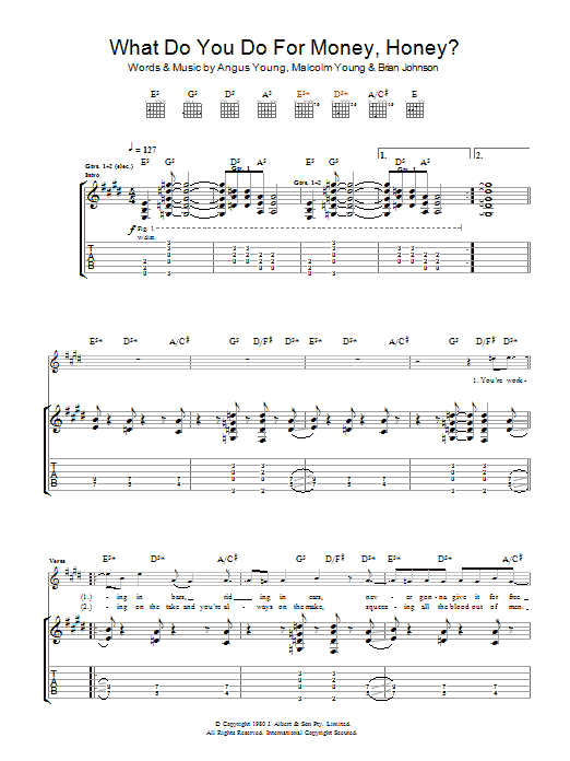 Download or print AC/DC What Do You Do For Money, Honey? sheet music, chords and digital score arranged for Guitar Chords/Lyrics. This Rock score includes 2 page(s).