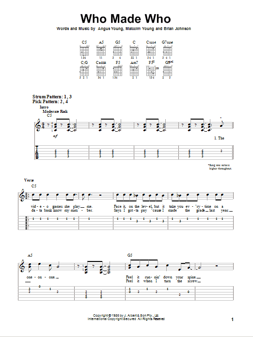 Download or print AC/DC Who Made Who sheet music, chords and digital score arranged for Easy Guitar Tab. This Metal score includes 5 page(s).