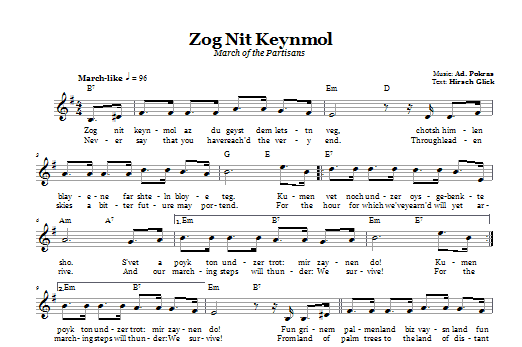 Download or print Ad. Pokras Zog Nit Keynmol (March Of The Partisans) sheet music, chords and digital score arranged for Lead Sheet / Fake Book. This Traditional score includes 1 page(s).