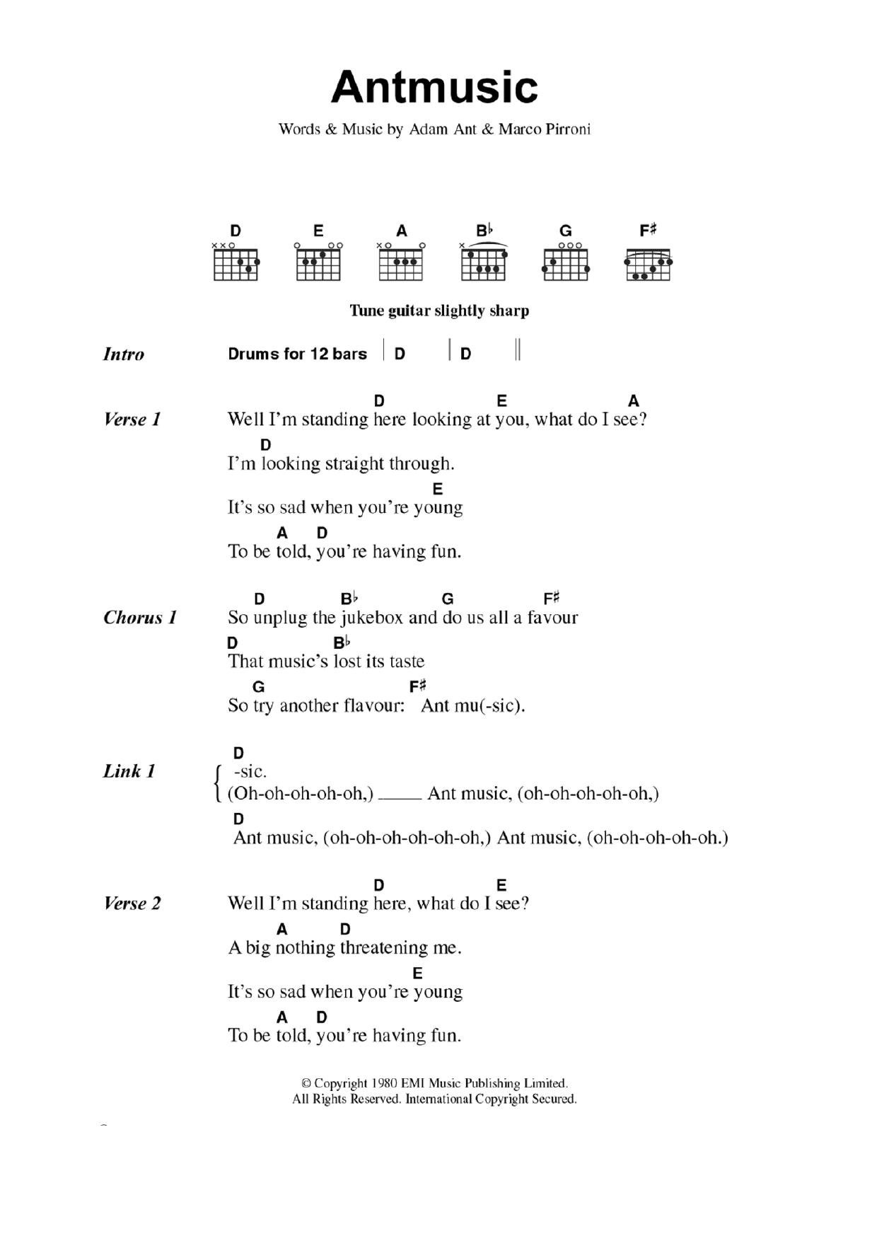 Download or print Adam And The Ants Antmusic sheet music, chords and digital score arranged for Guitar Chords/Lyrics. This Pop score includes 2 page(s).