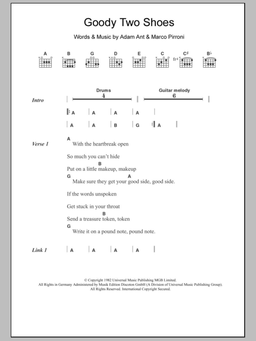 Download or print Adam and the Ants Goody Two Shoes sheet music, chords and digital score arranged for Guitar Chords/Lyrics. This Rock score includes 3 page(s).