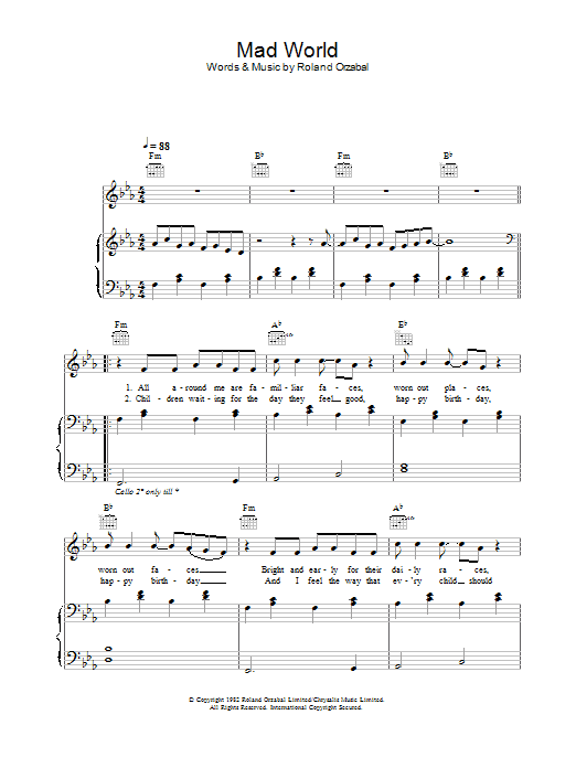 Download or print Gary Jules Mad World sheet music, chords and digital score arranged for Piano, Vocal & Guitar Chords (Right-Hand Melody). This Pop score includes 3 page(s).