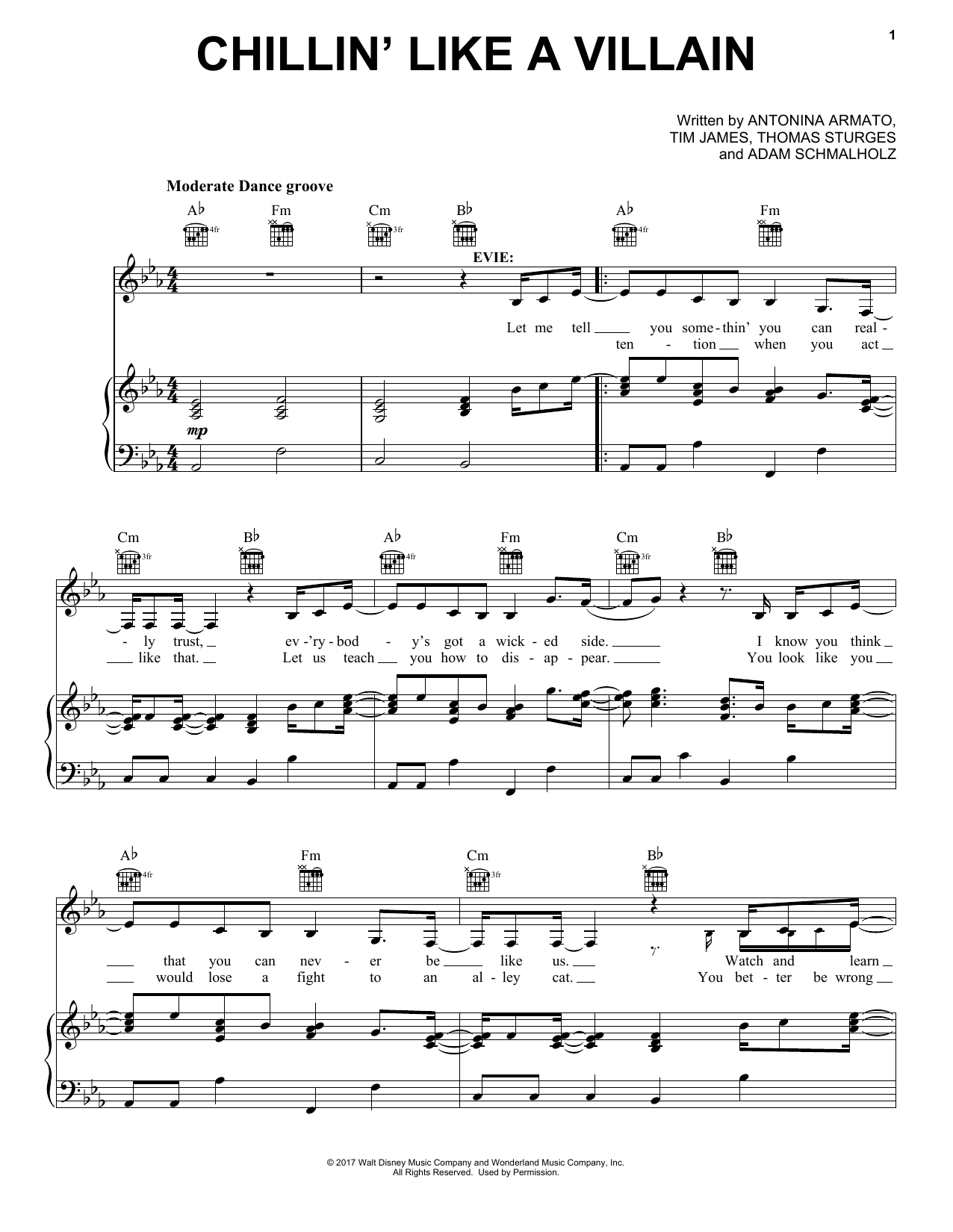 Download or print Adam Schmalholz Chillin' Like a Villain (from Disney's Descendants 2) sheet music, chords and digital score arranged for Easy Piano. This Disney score includes 6 page(s).