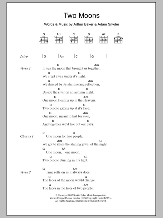 Download or print Adam Snyder Two Moons sheet music, chords and digital score arranged for Guitar Chords/Lyrics. This Country score includes 3 page(s).
