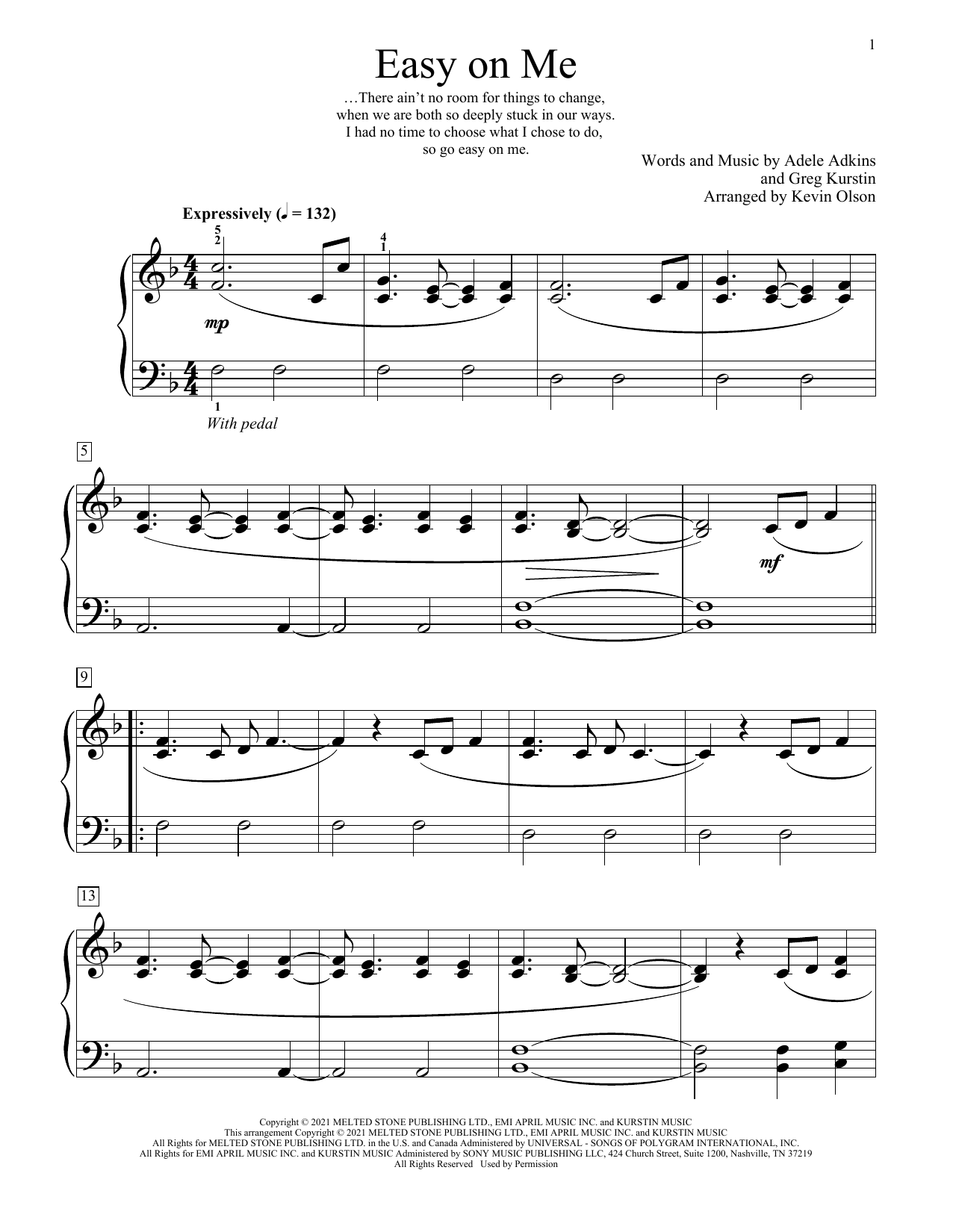 Download or print Adele Easy On Me (arr. Kevin Olson) sheet music, chords and digital score arranged for Educational Piano. This Pop score includes 3 page(s).
