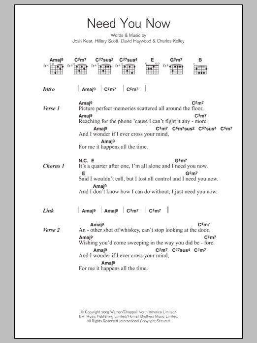 Download or print Adele Need You Now sheet music, chords and digital score arranged for Guitar Chords/Lyrics. This Pop score includes 2 page(s).