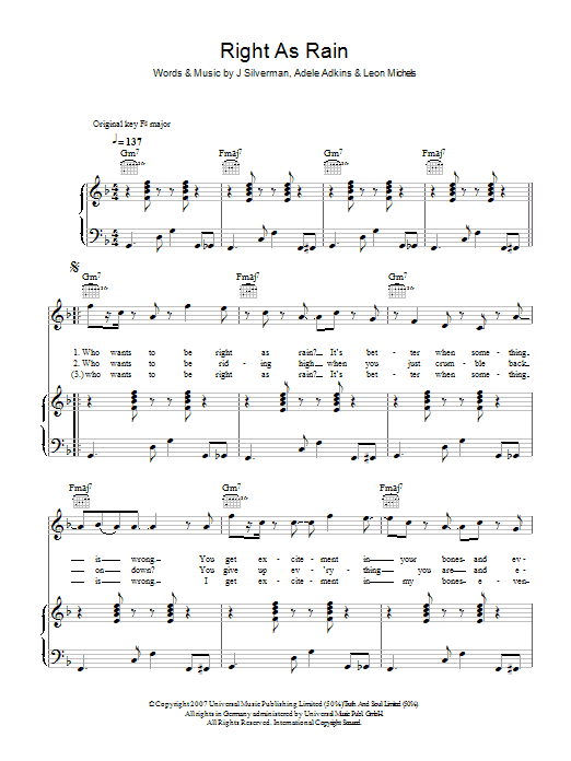 Download or print Adele Right As Rain sheet music, chords and digital score arranged for Really Easy Piano. This Pop score includes 2 page(s).