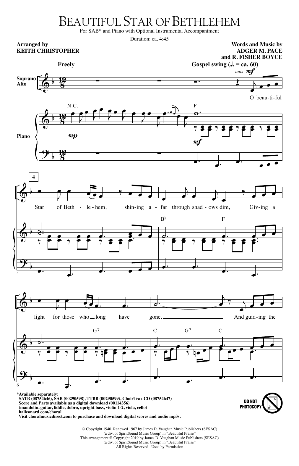 Download or print Adger M. Pace and R. Fisher Boyce Beautiful Star Of Bethlehem (arr. Keith Christopher) sheet music, chords and digital score arranged for SAB Choir. This Gospel score includes 8 page(s).