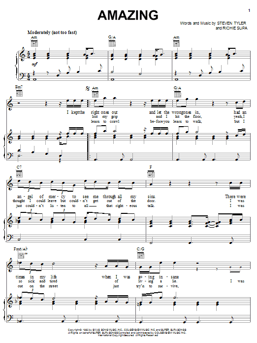 Download or print Aerosmith Amazing (It's Amazing) sheet music, chords and digital score arranged for Piano, Vocal & Guitar Chords (Right-Hand Melody). This Pop score includes 5 page(s).
