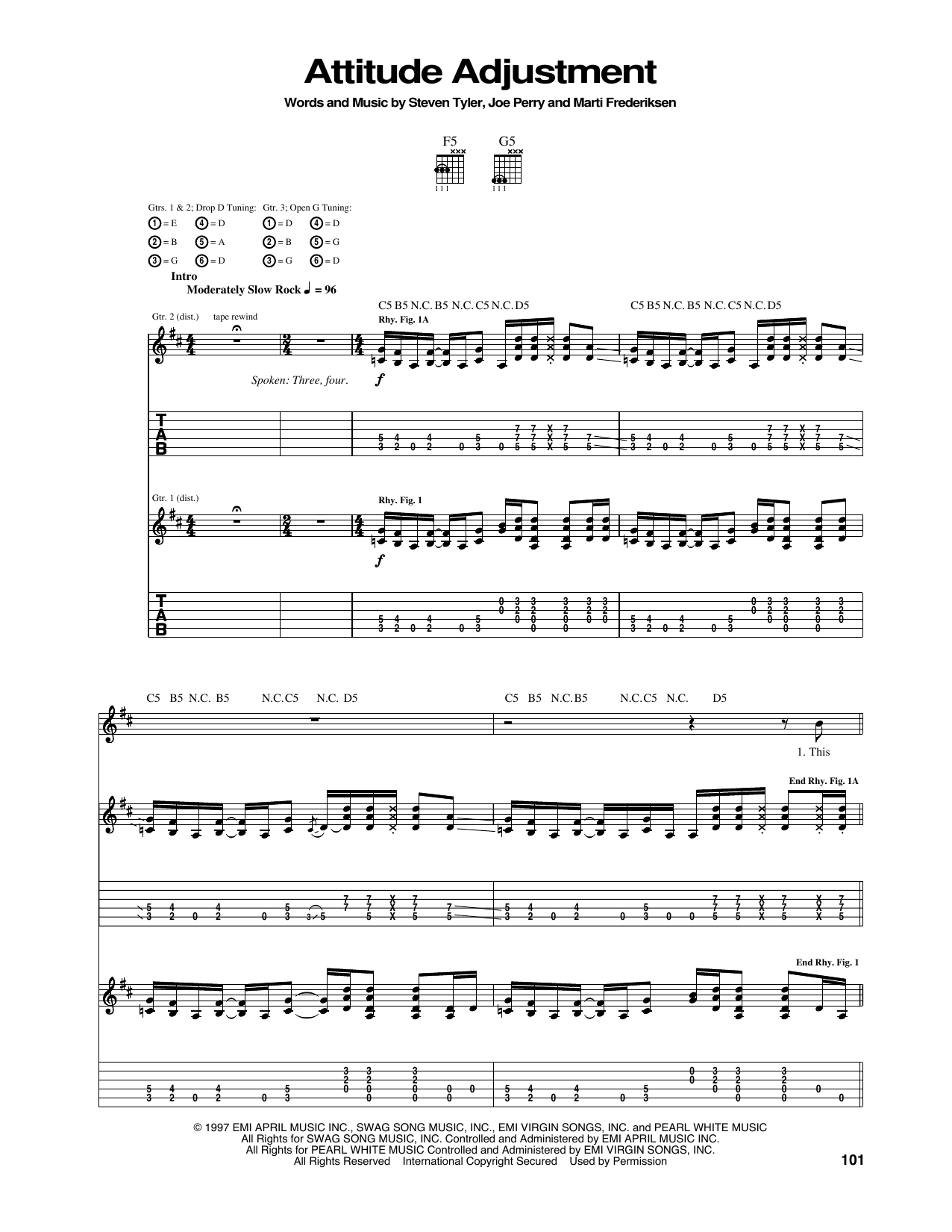 Download or print Aerosmith Attitude Adjustment sheet music, chords and digital score arranged for Guitar Tab. This Pop score includes 7 page(s).