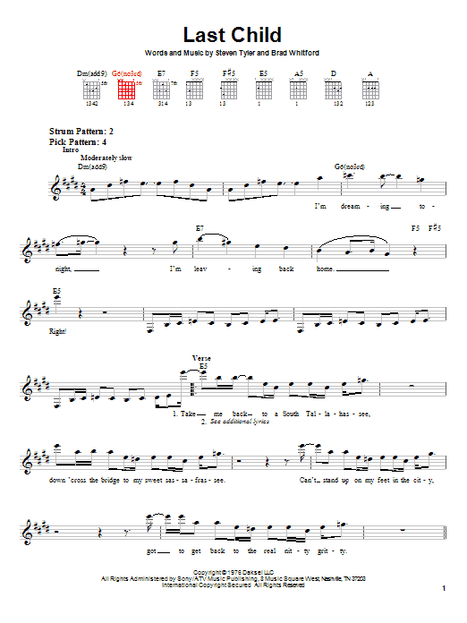 Download or print Aerosmith Last Child sheet music, chords and digital score arranged for Piano, Vocal & Guitar Chords (Right-Hand Melody). This Rock score includes 4 page(s).