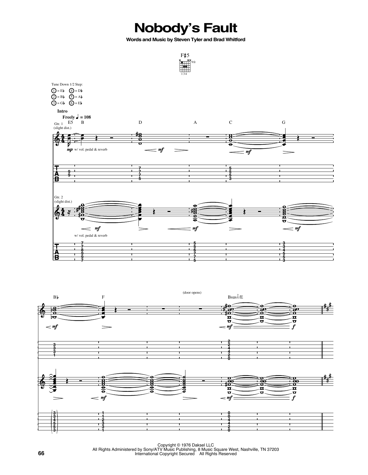Download or print Aerosmith Nobody's Fault sheet music, chords and digital score arranged for Guitar Tab. This Pop score includes 9 page(s).