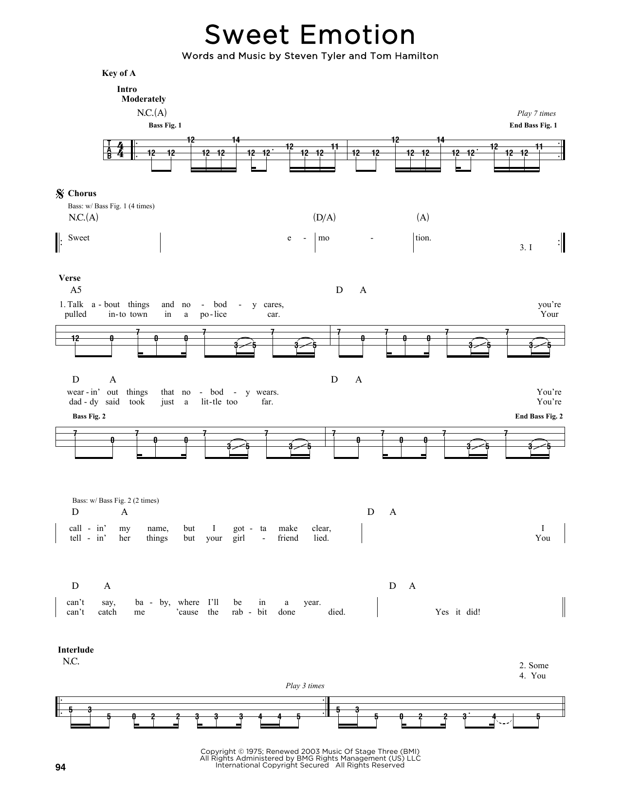 Download or print Aerosmith Sweet Emotion sheet music, chords and digital score arranged for Piano, Vocal & Guitar Chords (Right-Hand Melody). This Metal score includes 4 page(s).