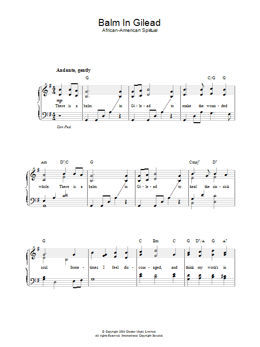 Download or print African-American Spiritual Balm In Gilead sheet music, chords and digital score arranged for Easy Piano. This Christian score includes 3 page(s).