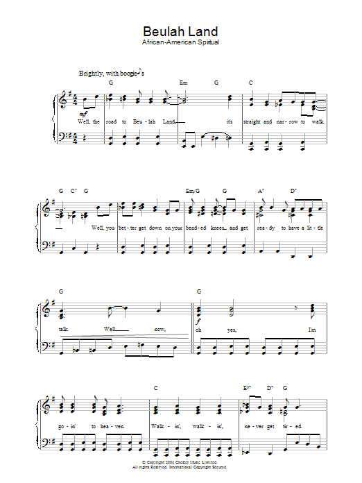 Download or print African-American Spiritual Beulah Land sheet music, chords and digital score arranged for Easy Piano. This Inspirational score includes 2 page(s).