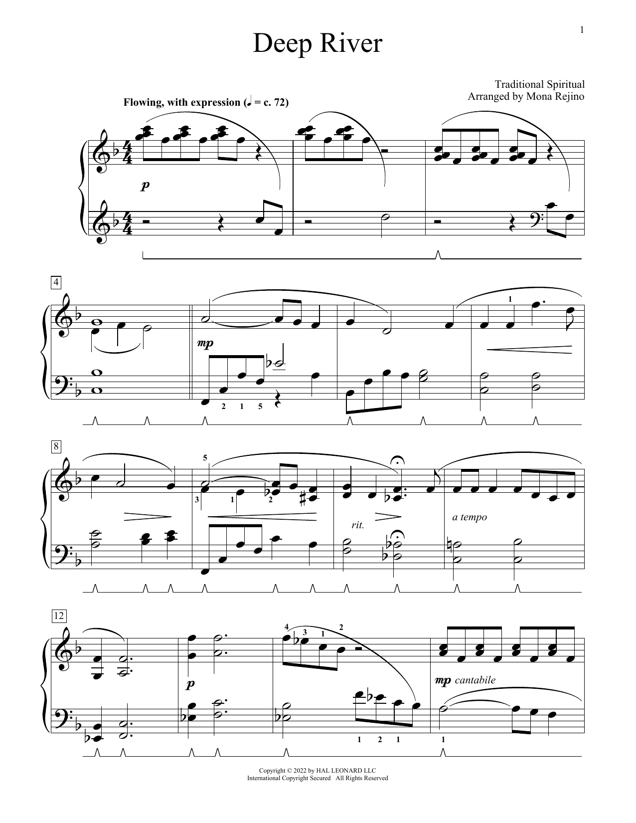 Download or print African-American Spiritual Deep River (arr. Mona Rejino) sheet music, chords and digital score arranged for Educational Piano. This Instructional score includes 3 page(s).