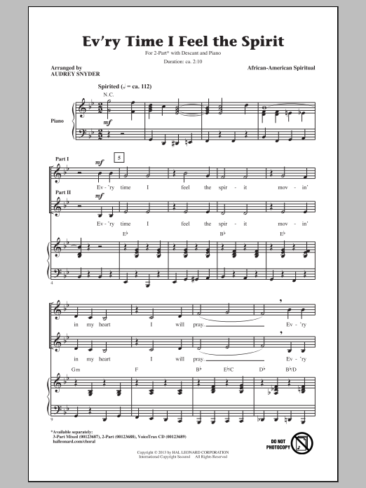 Download or print Audrey Snyder Every Time I Feel The Spirit sheet music, chords and digital score arranged for 3-Part Mixed Choir. This Spiritual score includes 2 page(s).