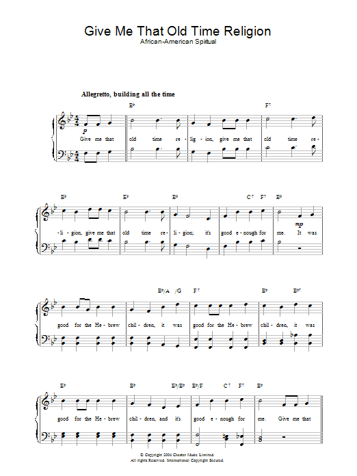 Download or print African-American Spiritual Give Me That Old Time Religion sheet music, chords and digital score arranged for Easy Piano. This Folk score includes 3 page(s).