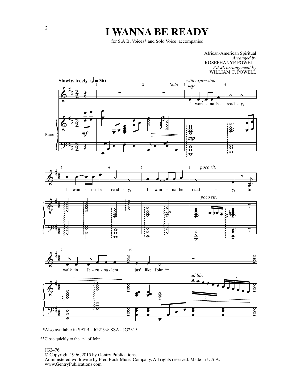 Download or print African-American Spiritual I Wanna Be Ready (arr. William C. Powell) sheet music, chords and digital score arranged for SAB Choir. This Concert score includes 11 page(s).