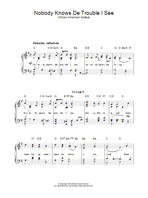 Download or print African-American Spiritual Nobody Knows De Trouble I See sheet music, chords and digital score arranged for Easy Piano. This Inspirational score includes 2 page(s).