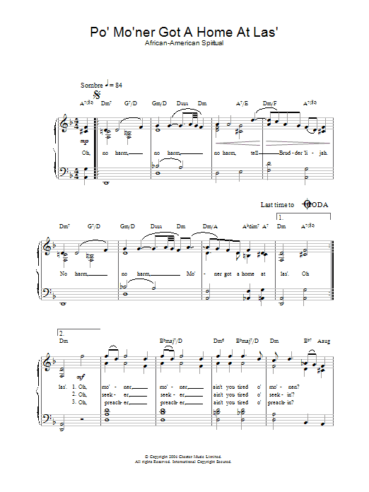 Download or print African-American Spiritual Po' Mo'ner Got A Home At Las' sheet music, chords and digital score arranged for Easy Piano. This Inspirational score includes 2 page(s).
