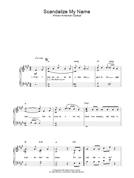 Download or print African-American Spiritual Scandalize My Name sheet music, chords and digital score arranged for Easy Piano. This Inspirational score includes 2 page(s).