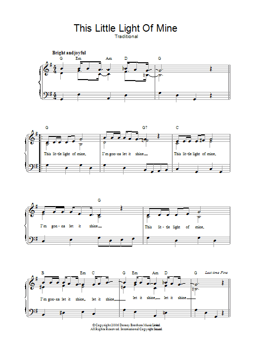 Download or print African-American Spiritual This Little Light Of Mine sheet music, chords and digital score arranged for Piano & Vocal. This Christian score includes 3 page(s).