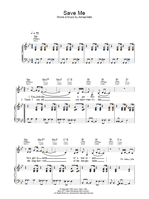 Download or print Aimee Mann Save Me sheet music, chords and digital score arranged for Guitar Chords/Lyrics. This Rock score includes 3 page(s).
