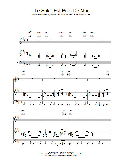 Download or print Air Le Soleil Est Pres De Moi sheet music, chords and digital score arranged for Piano, Vocal & Guitar Chords. This Hip-Hop score includes 4 page(s).
