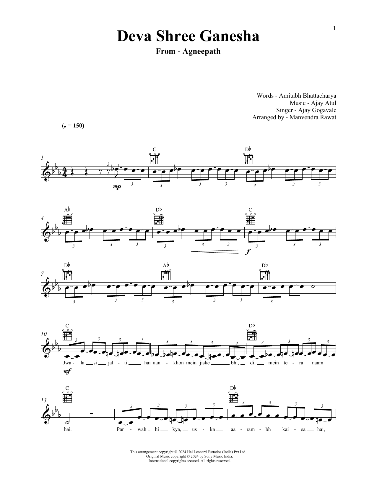 Download or print Ajay-Atul and Ajay Gogavale Deva Shree Ganesha (from Agneepath) sheet music, chords and digital score arranged for Lead Sheet / Fake Book. This Hindi score includes 4 page(s).