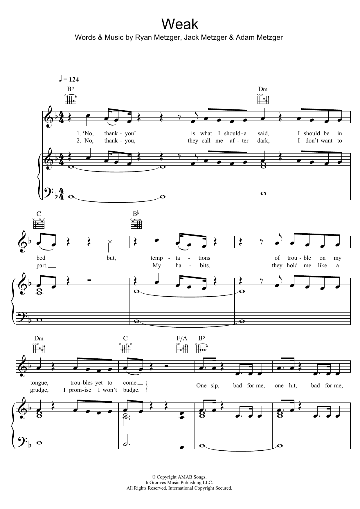 Download or print AJR Weak sheet music, chords and digital score arranged for Piano, Vocal & Guitar Chords. This Pop score includes 5 page(s).