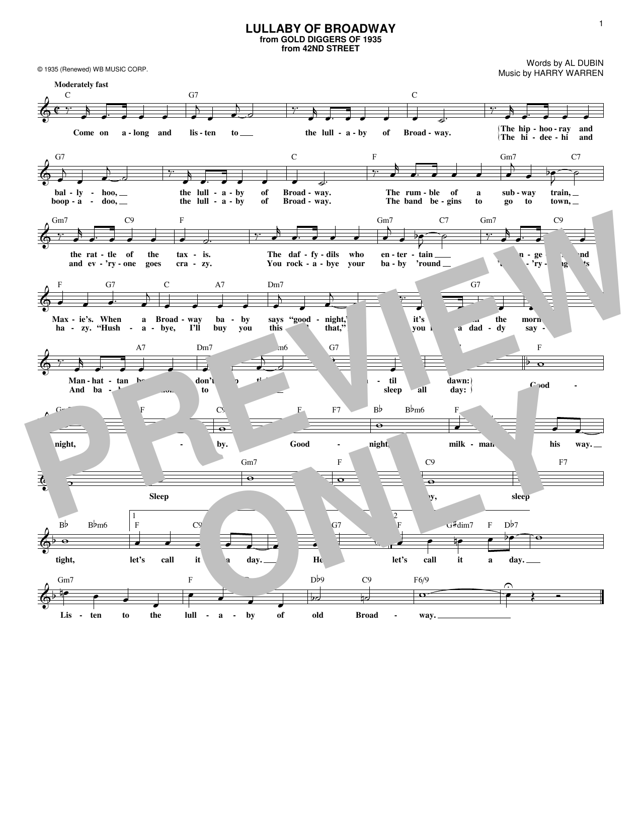 Download or print Al Dubin Lullaby Of Broadway sheet music, chords and digital score arranged for Vocal Pro + Piano/Guitar. This Jazz score includes 6 page(s).