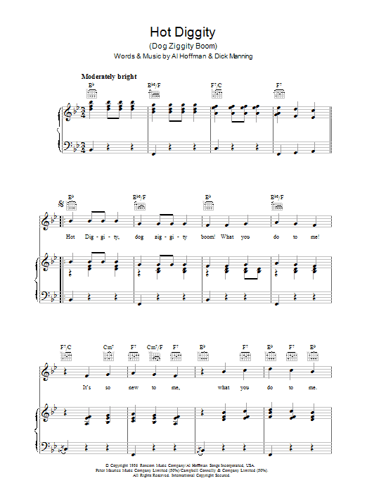 Download or print Al Hoffman Hot Diggity (Dog Ziggity Boom) sheet music, chords and digital score arranged for Piano, Vocal & Guitar Chords. This Pop score includes 4 page(s).