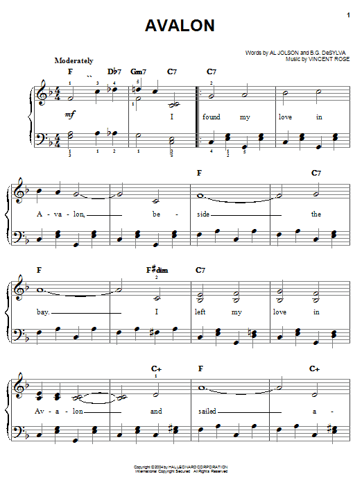 Download or print Al Jolson Avalon sheet music, chords and digital score arranged for Real Book – Melody & Chords – C Instruments. This Jazz score includes 1 page(s).