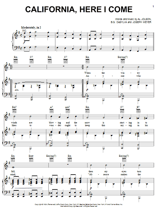 Download or print Al Jolson California, Here I Come sheet music, chords and digital score arranged for Piano, Vocal & Guitar Chords (Right-Hand Melody). This Pop score includes 5 page(s).