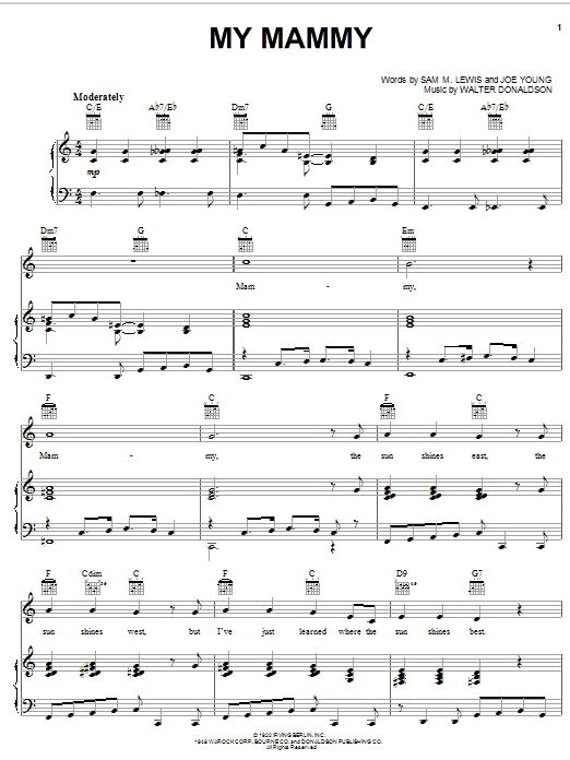 Download or print Al Jolson My Mammy sheet music, chords and digital score arranged for Piano, Vocal & Guitar Chords (Right-Hand Melody). This Film/TV score includes 3 page(s).