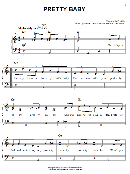 Download or print Al Jolson Pretty Baby sheet music, chords and digital score arranged for Piano, Vocal & Guitar Chords. This Standards score includes 4 page(s).
