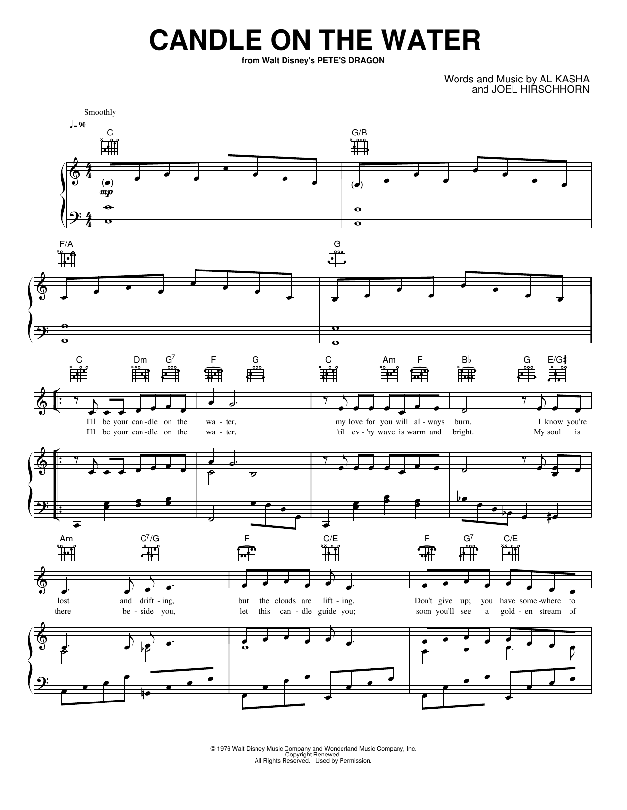 Download or print Al Kasha Candle On The Water sheet music, chords and digital score arranged for Piano, Vocal & Guitar Chords (Right-Hand Melody). This Pop score includes 3 page(s).