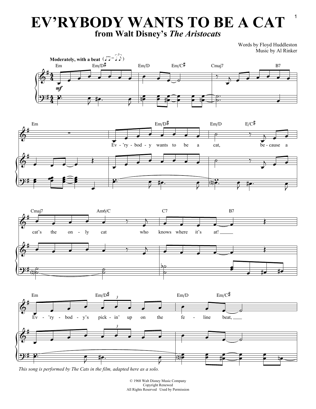 Download or print Floyd Huddleston & Al Rinker Ev'rybody Wants To Be A Cat (from The Aristocats) sheet music, chords and digital score arranged for Piano & Vocal. This Children score includes 3 page(s).