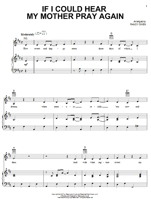 Download or print Alabama If I Could Hear My Mother Pray Again sheet music, chords and digital score arranged for Piano, Vocal & Guitar Chords (Right-Hand Melody). This Christian score includes 8 page(s).