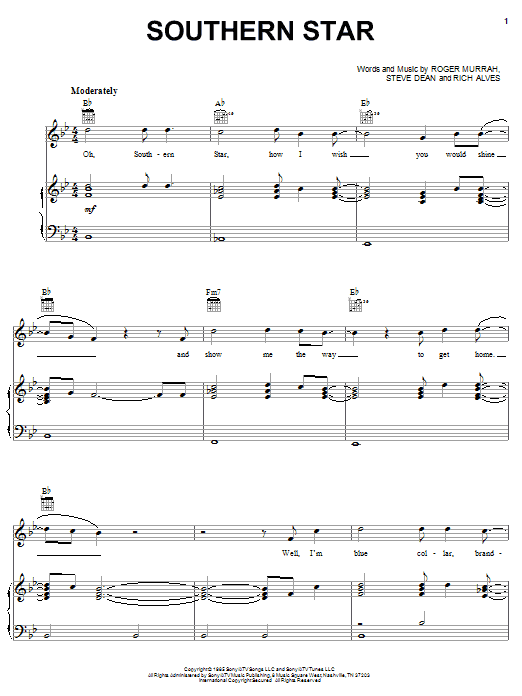 Download or print Alabama Southern Star sheet music, chords and digital score arranged for Piano, Vocal & Guitar Chords (Right-Hand Melody). This Country score includes 7 page(s).