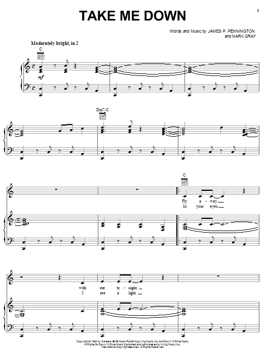 Download or print Alabama Take Me Down sheet music, chords and digital score arranged for Piano, Vocal & Guitar Chords (Right-Hand Melody). This Country score includes 8 page(s).