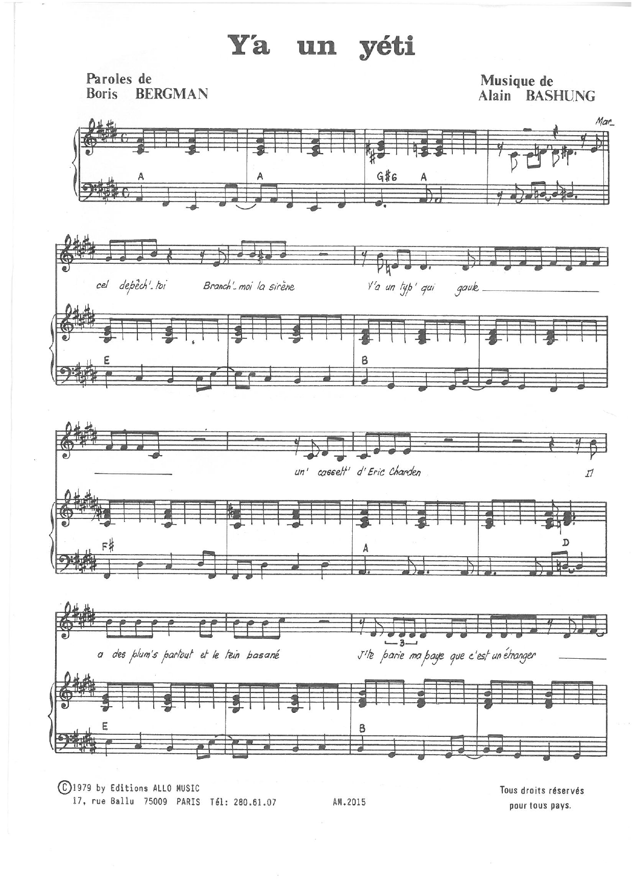 Download or print Alain Bashung Y'a un Yeti sheet music, chords and digital score arranged for Piano & Vocal. This Pop score includes 4 page(s).