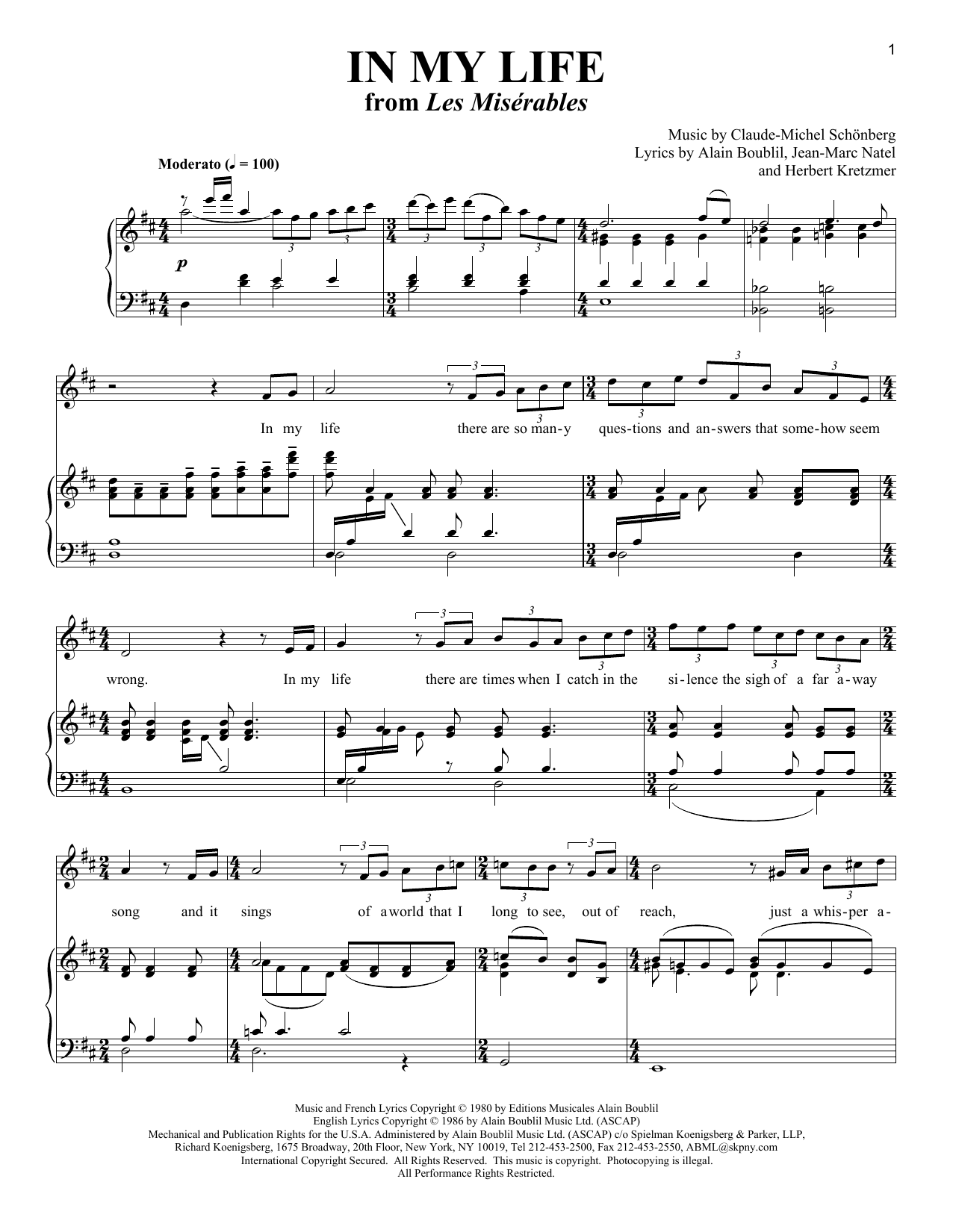 Download or print Alain Boublil In My Life (from Les Miserables) sheet music, chords and digital score arranged for Piano & Vocal. This Classical score includes 2 page(s).